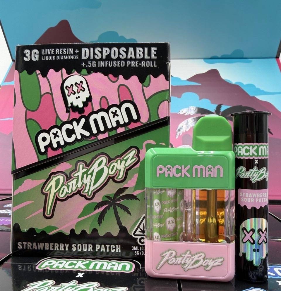 Packman x Partyboyz 3G Disposable brings a premium collaboration bundle featuring a 3G Live Resin + Liquid Diamonds Disposable paired with a .5G infused preroll for a complete, flavour-forward experience.